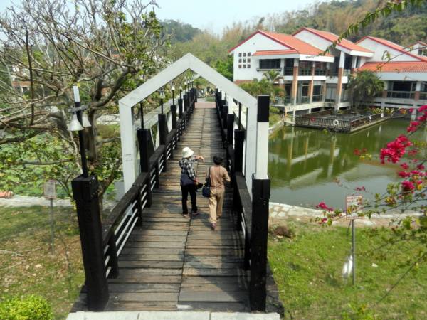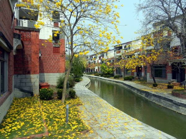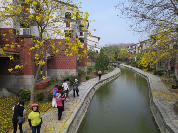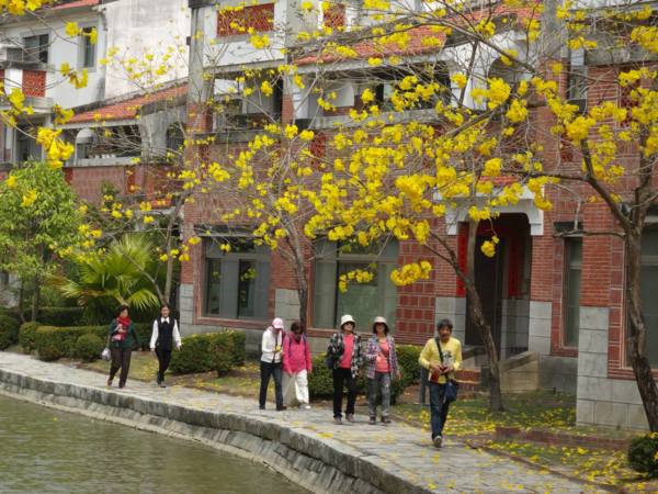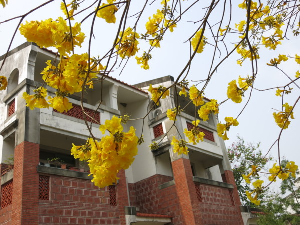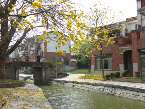 正值黃花風鈴木盛開季節, 與九重葛, 柳樹, 紅花綠葉, 形成岸上風光, 搭配池裡荷葉蓮花, 小橋流水人家, 職務宿舍宛如人間仙境, 教人流連忘返
