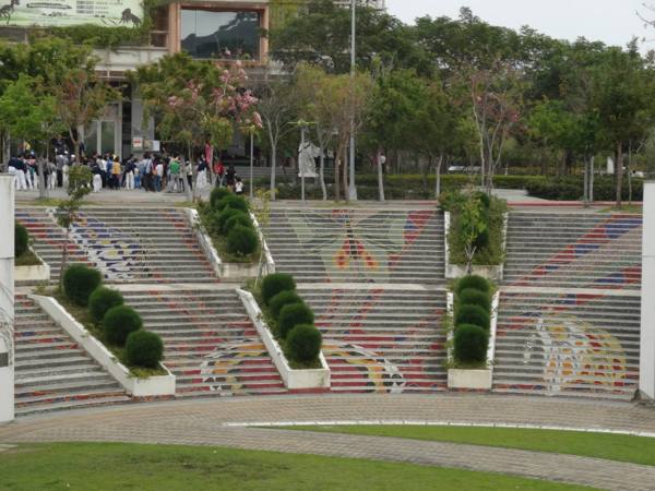 圖書館前的銅鏡廣場, 中央為古漢四鳳紋樣, 呼應圖書館上方的雙鳳, 充滿江南風味