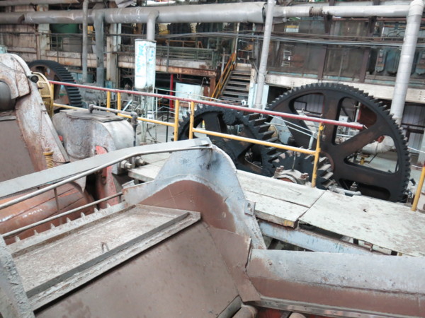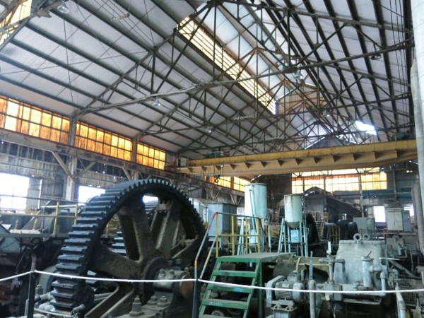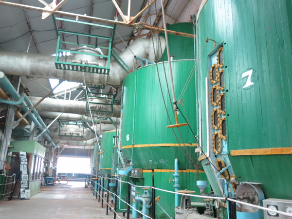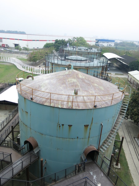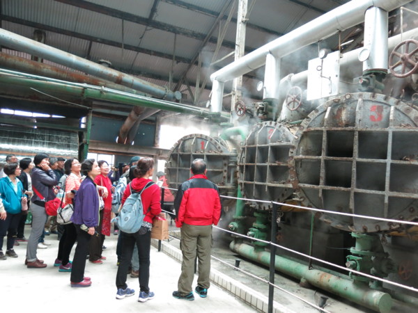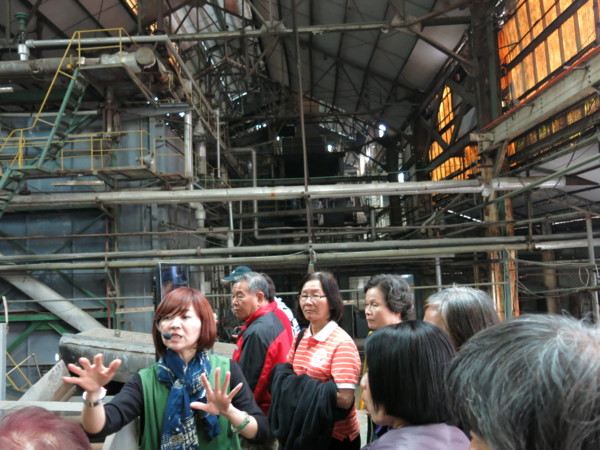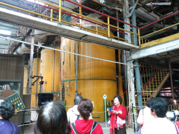 吳小姐解說仁德廠作業, 自甘蔗壓汁到製糖顆粒結晶為止, 帶大家走了一圈。眼前三大巨槽用來貯存糖蜜,而今改裝成不同設施。