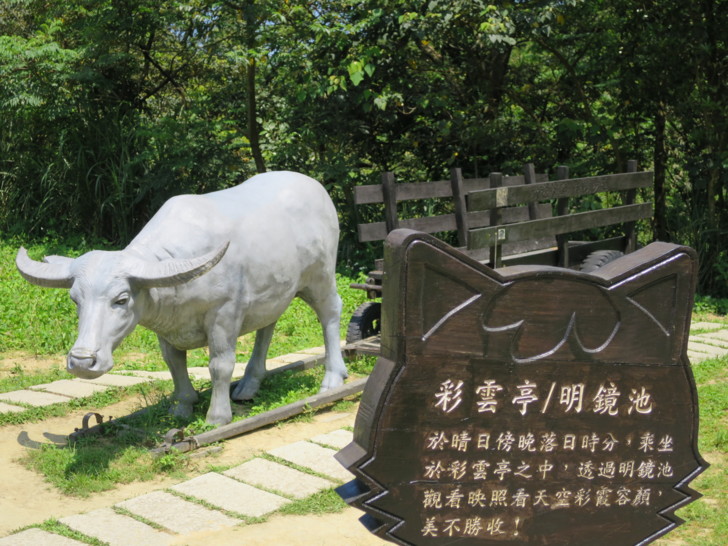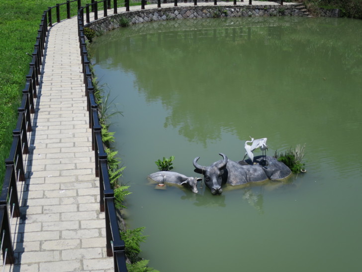 明鏡池中設置水牛和白鷺鷥的農村意象