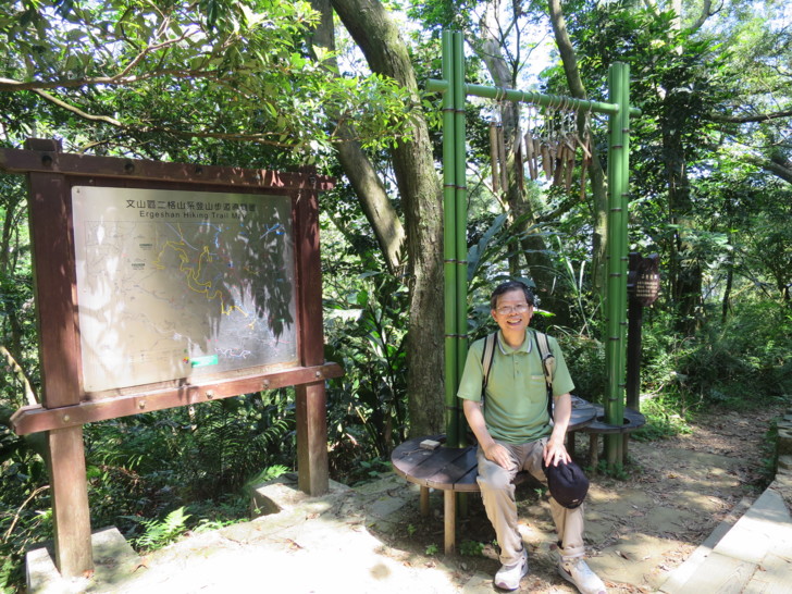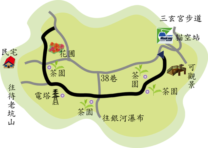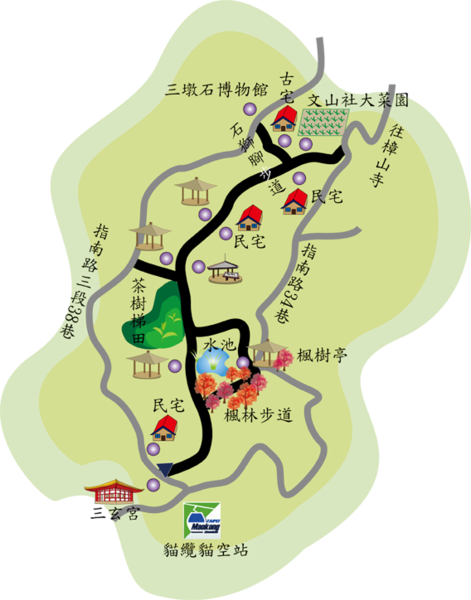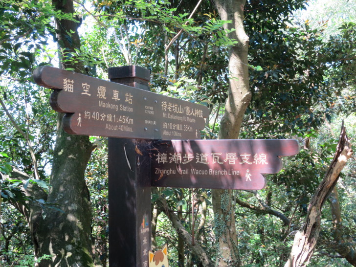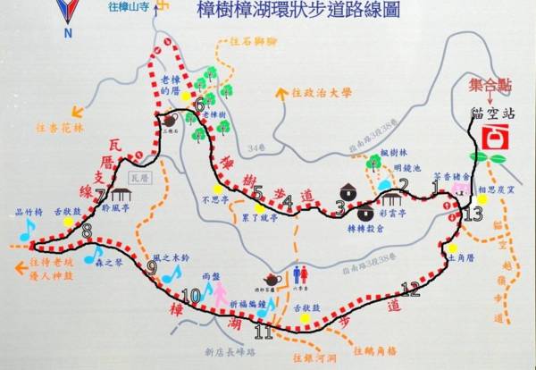 健行路線:貓纜貓空站→炭窯登山口→樟湖步道→優人神鼓→(折返)→樟湖步道瓦厝支線→聆風亭→明德宮→登高步道(望遠亭) → (折返)→樟樹步道 →貓空纜車站
