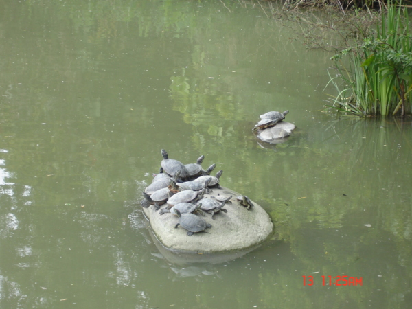 台大生態池的烏龜聚集在石頭上享受陽光。