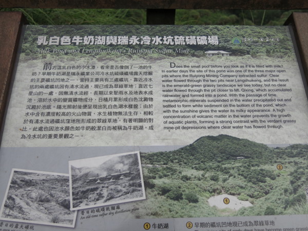牛奶湖為冷水坑的重要景觀之一,早期為瑞永礦業公司冷水坑硫磺礦場露天挖掘的主要礦坑凹地之一