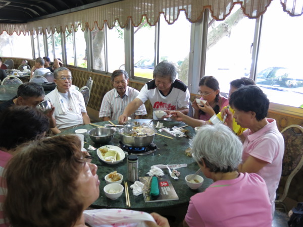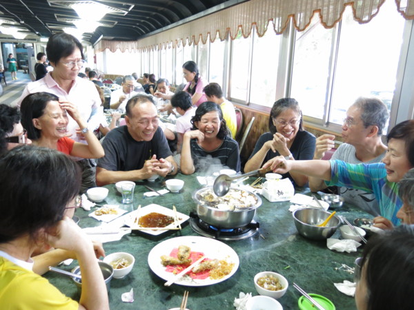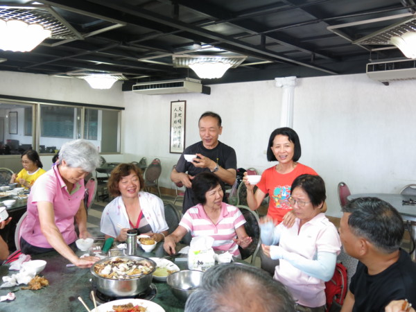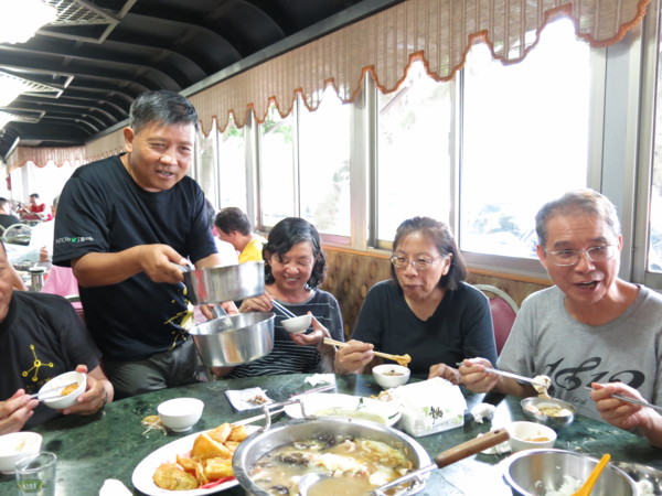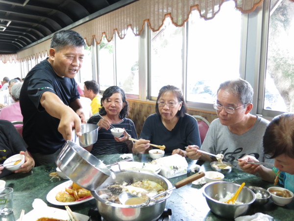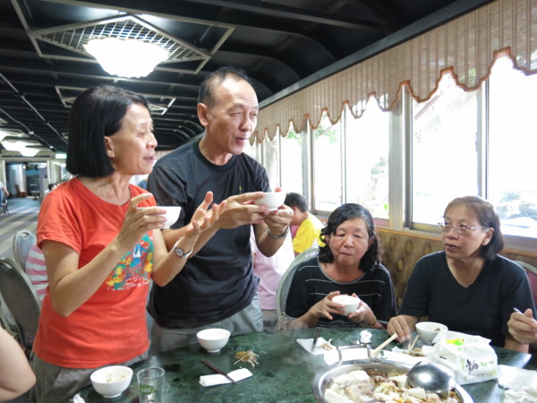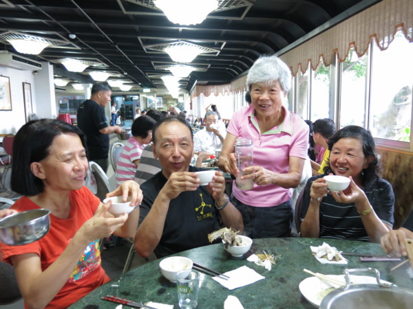 今天啖食尾聲,團長伉儷起身表明,感謝婚宴嫁女的同喜同歡,所以再造喜慶餘樂,掏銀買單,笑嘻嘻不但大方的讓團長破費了,還笑哈哈的玩笑盡出:早知道有人請客怎能不點白斬雞?早知道不花餐費怎能兩桌同吃一條魚?
