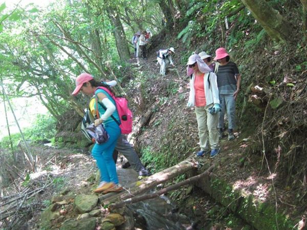 蔭裡的古道,落葉如毯、清景宜人;最驚險的是末段的水圳坎坷路,狹仄曲折、上下攀扶,笑嘻嘻