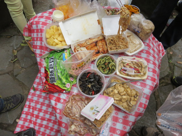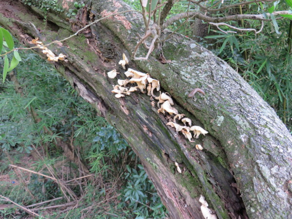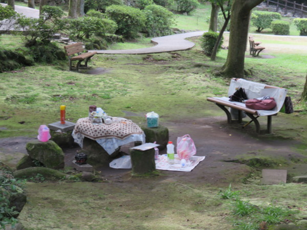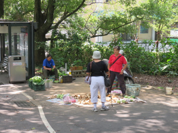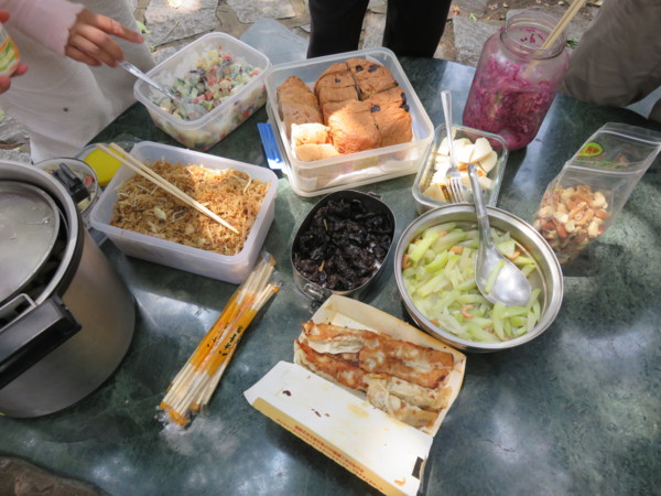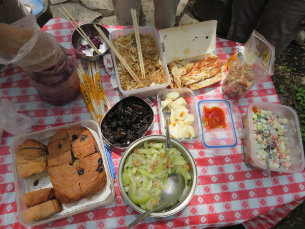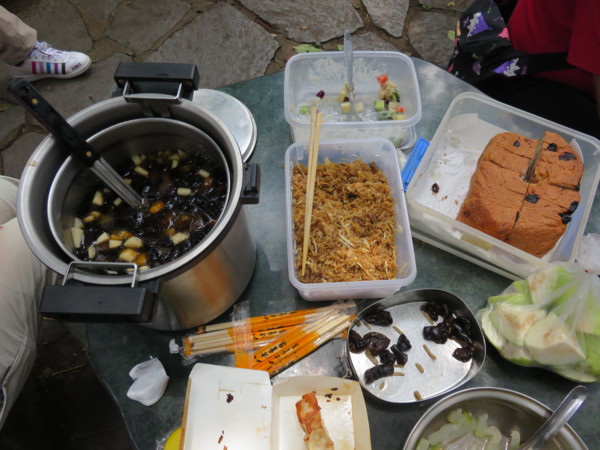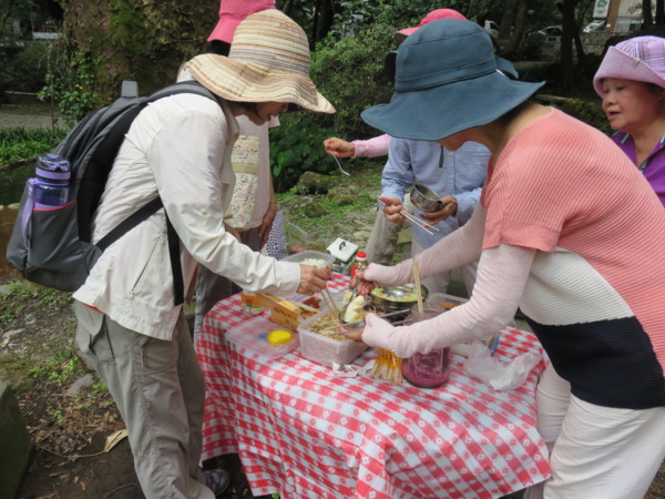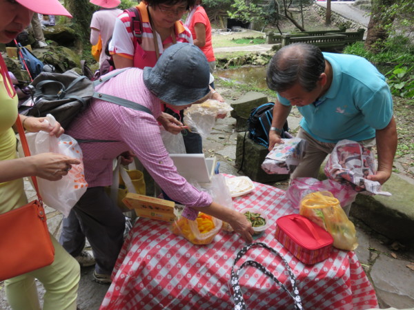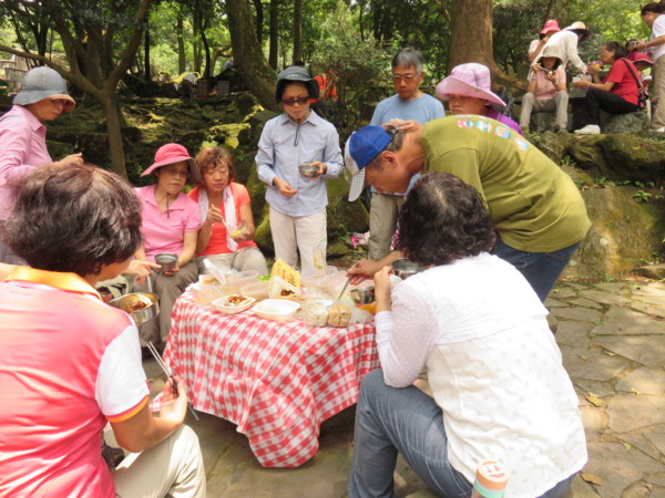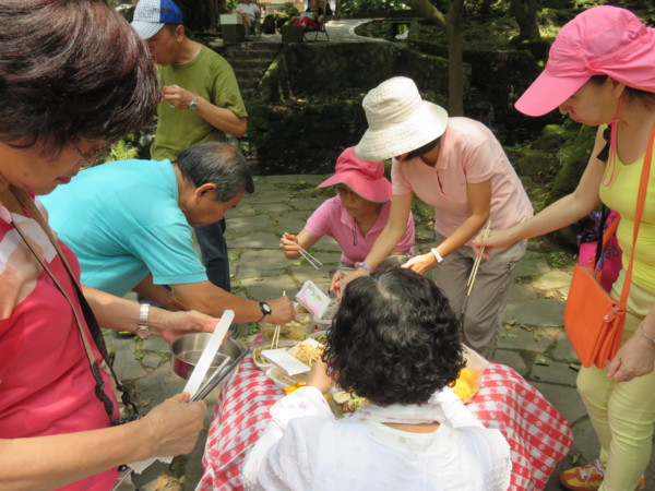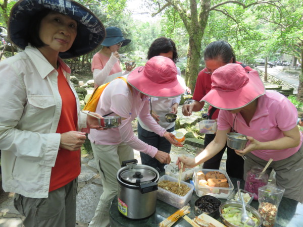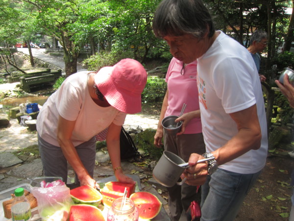 繼6月15日在陽明山大屯自然公園涼亭內辦桌後,今天大家又再度展現食神的另一面功夫,在前山公園的古樹蔭下,開起另一家五星級飯店,席開兩桌,分樓上樓下,熱鬧滾滾,主食有麵包、炒麵,鍋貼,其他大菜則有鹹蛋杏鮑菇、優格沙拉、手工雞肉絲、豬頭皮、南瓜醃梅子、炒黑木耳、各式水果、……,林真的一鍋冰甜點是壓軸,她卻意猶未盡,再拿出一顆西瓜,現剖現吃,每個隊友都說吃不下了,卻還是照吃不誤。有人說領導兩次都沒吃到這些菜色,有些遺憾,有人回說:沒關係,上次他在歐洲吃大餐,這次在北海道吃帝王蟹,都比我們吃得好。大家哈哈大笑,也結束了今天的健行。