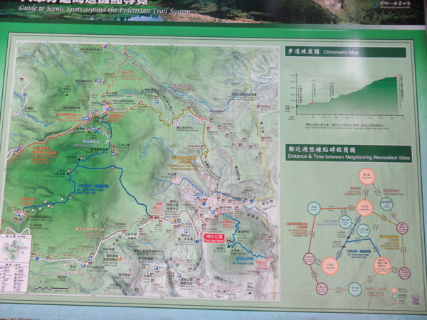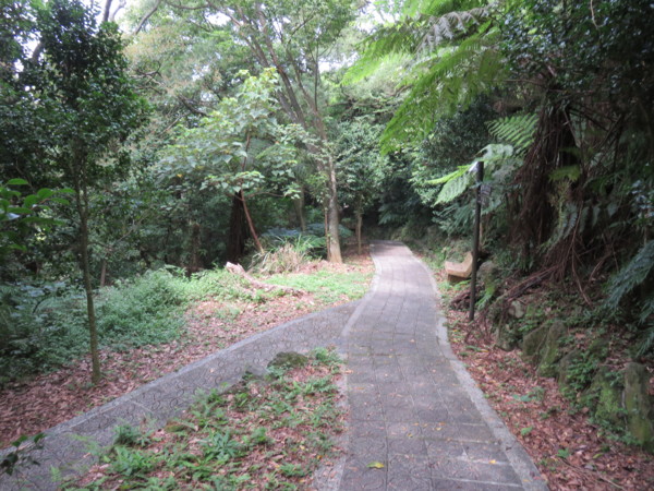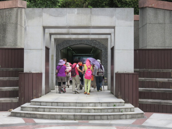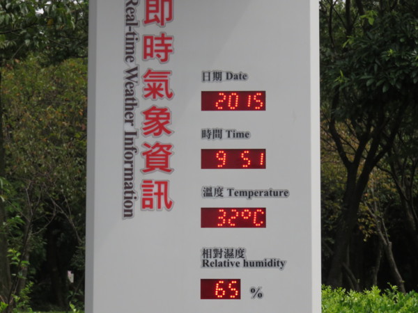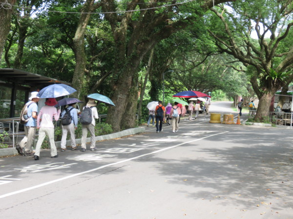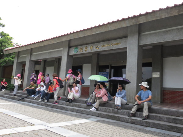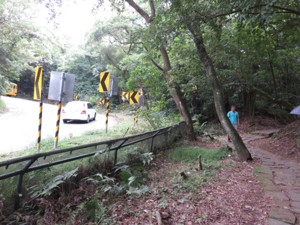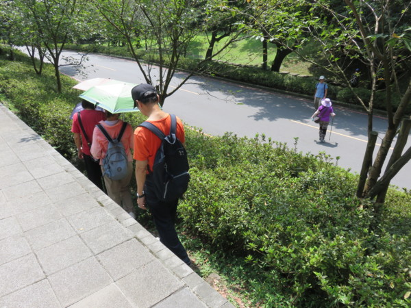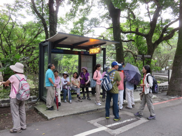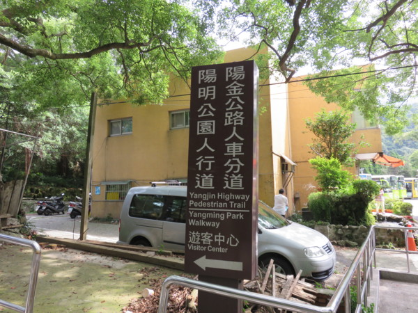 大家沿著紗帽路走入陽金公路人車分道的陽明公園人行道,從分道步道系統的起點,爬梯而上,是另一個地面,再沿著竹子湖路旁的步道,終於來到陽明山遊客中心,遊客中心旁的氣象資訊顯示山上溫度是32度,果然比山下涼快些。