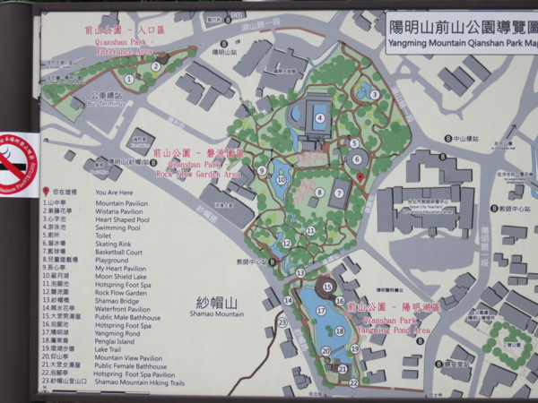 健行路線:陽明山前山公園→陽金公路人車分道系統→後山公園→(陽明山遊客中心)→(陽明公園) →返回前山公園