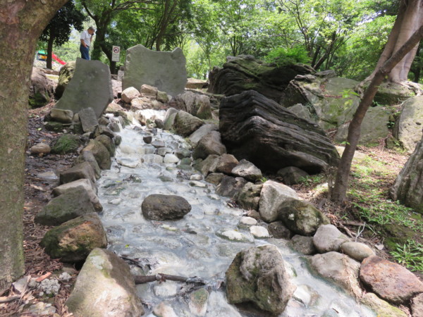 硫磺泉水潺潺過, 連溪底石頭都染白了