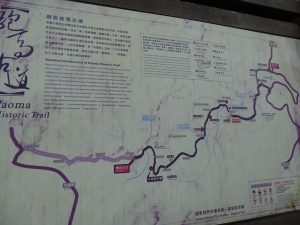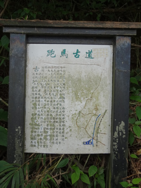 五.古道報報:淡蘭古道為淡蘭之間往來的古道之一.是早期淡水廳(台北一帶)到噶瑪蘭(蘭陽地區)之間的往來道路.分北線與南線.北線正式形成於嘉慶年間.南線年代略晚於北線大約於清咸豐同治年間.而跑馬古道是淡蘭古道南線其中一段.早期先民常利用跑馬古道來搬運木材.在路上置圓木枕以木馬搬運木材所以有*木馬路*之稱.曾是日軍戰馬奔馳的道路故居民稱之*陸軍路*或*跑馬路*.北宜公路完成後這路漸荒廢.後來礁溪鄉公所重新整理這條古道.於是命名為跑馬古道.礁溪五峰路到北宜公路最高點的石牌約6.7公里.古道南口到上新花園約3.1公里.