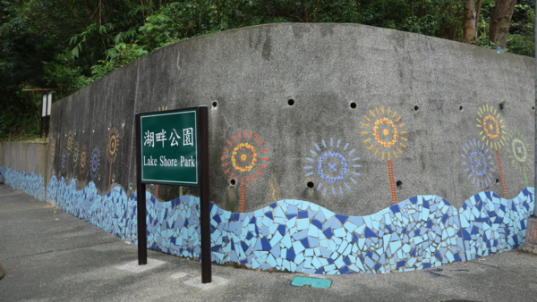 招牌指的湖畔公園,已不存在,誤導大家站著徘徊,但馬賽克牆很漂亮,照相吧!