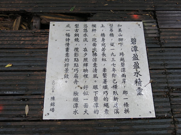 健行路線:新店捷運總站→碧潭東岸→碧潭吊橋→吊橋西岸橋頭和美山步道入口→迎賓台→右線綠色親山步道→幸福廣場→和美山頂觀景台→星光草原→紫蓮生態池→筆羅子步道→幸福廣場→往渡船頭林道→藍色水岸步道→綠色親山步道→碧潭吊橋→走民宅後徑往捷運站〈全程4.3公里,歷時2小時50分〉