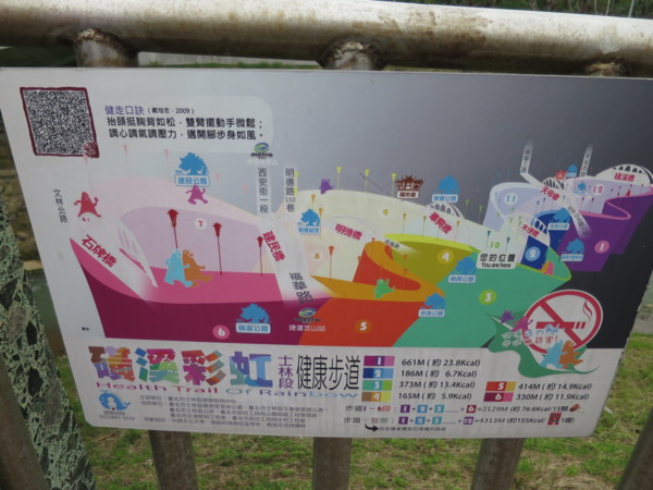↑磺溪彩虹健康步道分割成紅、橘、黃、綠、藍、紫6個路段,每段都標示有距離與消耗的熱量。
