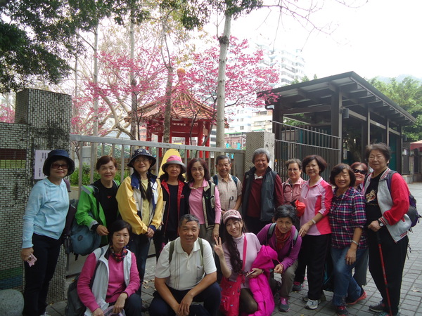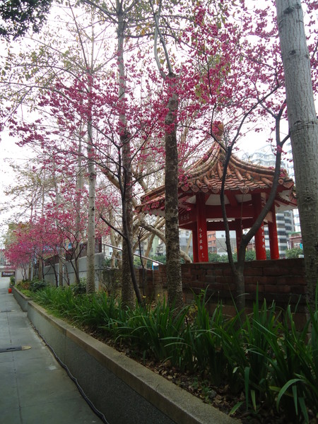 公車終點,明志國小,眾人搶拍校園內一排盛開的美麗櫻花。