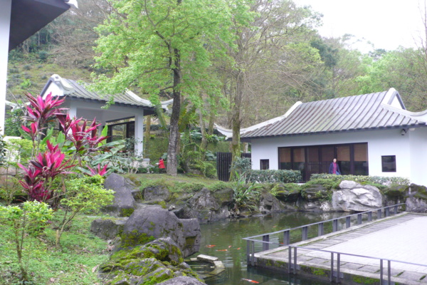 兩個亭子都設有木製桌椅,亭外青山綠樹,流水魚塘,極為幽靜。