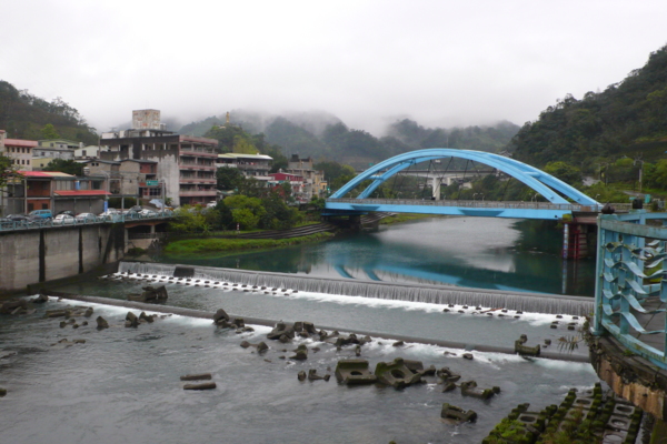 藍色鋼泥的坪林拱橋在1998年正式通車,取代坪林舊橋的功能。