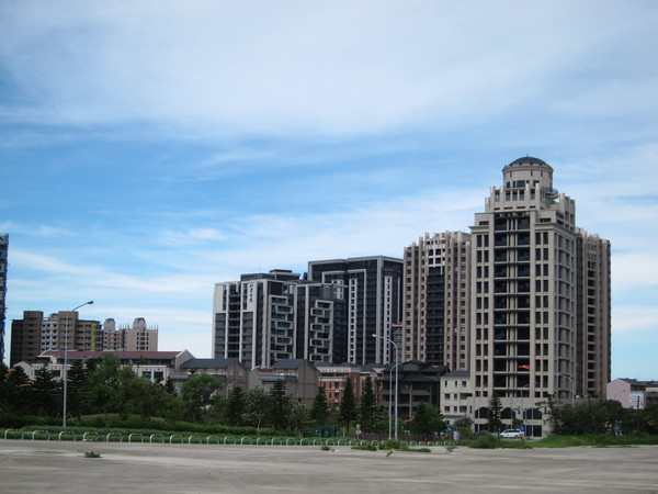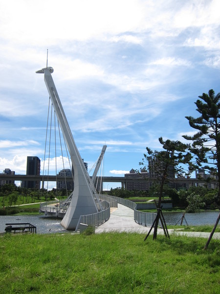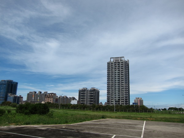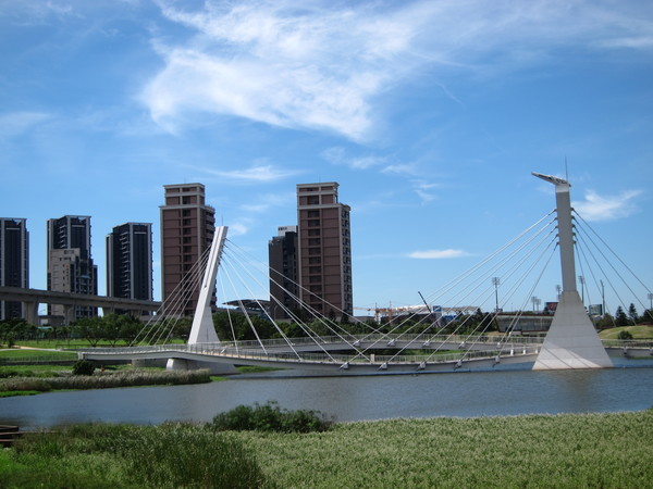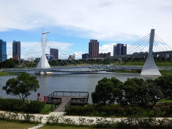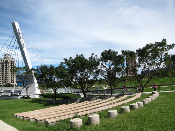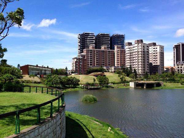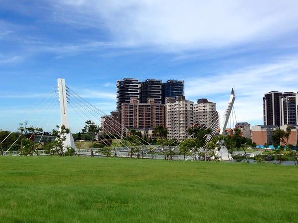 青翠乾淨的草皮。背景是青塘橋與附近豪宅。