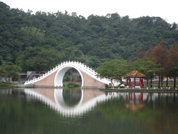 連成一個圓的湖心拱橋和倒影靜靜地依偎著青山層巒