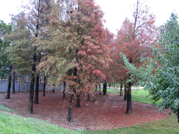 入秋冬,落羽松慢慢轉成紅褐色,羽毛似的葉片會隨風飄落,故有「落羽松」之稱號