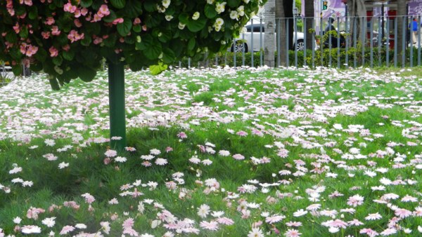 朵朵鮮紅小花瓣掉落在花毯上,更添繽紛。