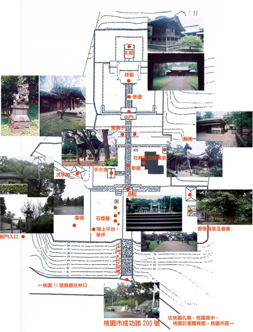 3.基地內有原桃園神社建物:本殿、拜殿、中門、柵欄、唐獅子、銅馬、社