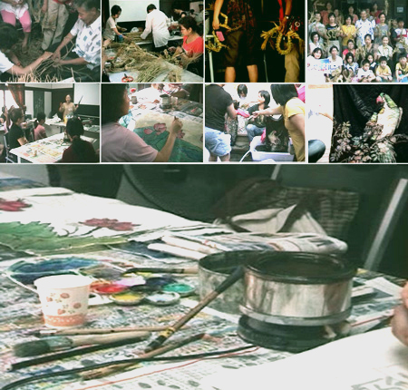 學員們來學蠟染,有自己能畫、能寫法書的,有臨摹老師提供畫本的;玩了兩天,都染出了作品帶回家。有些作品雖然是初學成果,拿到市集也能賣得好價錢,任何作品無論是山水畫、工筆畫或是卡通圖象,因為蠟染會產生自然的裂紋,染料滲透其中常有意想不到的藝術效果;像是自然的巧妙參與了人為的創作。這些作品或是抱枕或是畫布或是餐巾,都可以用為美化家居。那些稻草編的作品,作為家飾也很別緻。