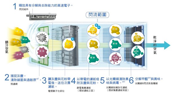 第一道初步的濾網過濾,讓灰塵髒東西帶電,在閃流的範圍裡面用光觸媒產生作用,達到殺菌除異味的效果。