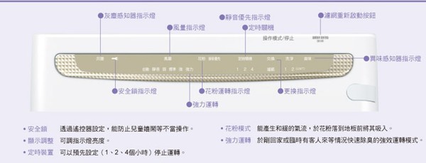 定時裝置、強力運轉模式、兒童安全鎖、花粉模式