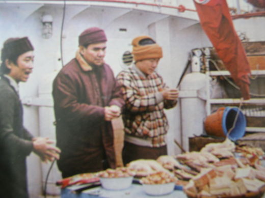 ﹂海功號」大廚在船長指示下,開始忙了起來。原來依據船上習俗,出航前須祭拜海上﹂好兄弟」,祈求他們的庛護;祭拜儀式與陸上相同,治具三牲、果品之外,也須點香,由船長帶頭一一祭拜,並將冥紙撤入大海。