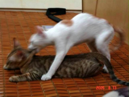 這有點給他誇張哩 要趕快結扎唷 以前獸醫也說我們家fifi還不到結扎的時候 沒想到有一天早上球球一個翻身跳上fifi的背 開始了傳宗接代的動作 哇哩勒 還是兩隻小小貓而已耶 看來你的寶貝和我的一樣 太早熟啦~~ baby blue ~~