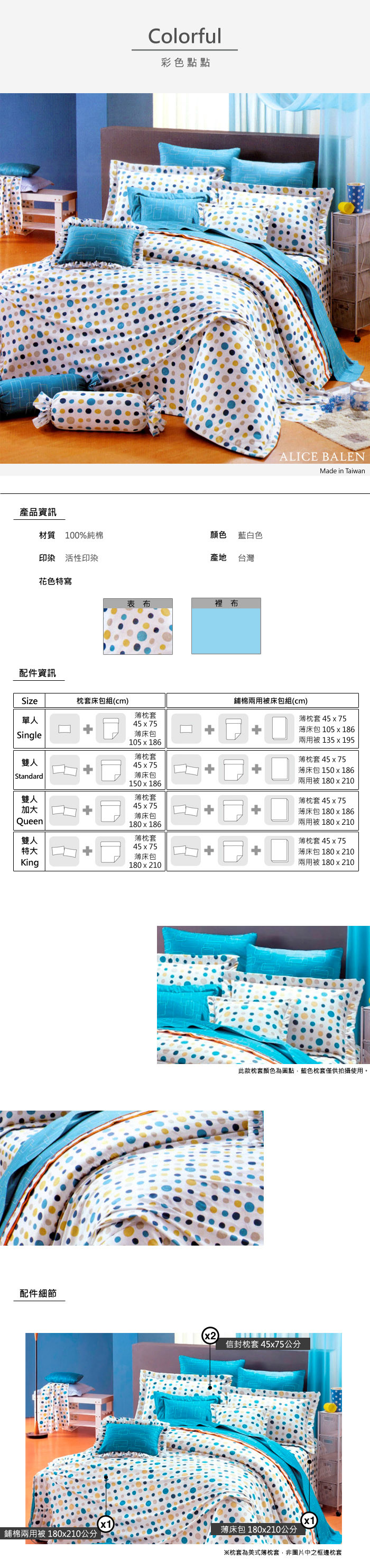 - 【艾莉絲-貝倫】彩色點點(6.0呎x7.0呎)四件式雙人特大(100%高級純棉)鋪棉兩用被套床包組[台灣製造]-藍白色/橘白色