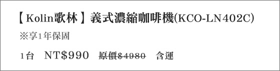 商品訊息簡述: 只要990元(含運)即可購得【Kolin歌林】原價4980元義式濃縮咖啡機(KCO-LN402C)1台,享1年保固。