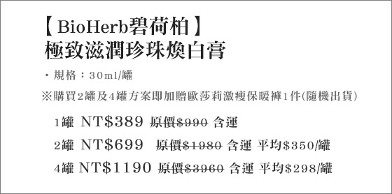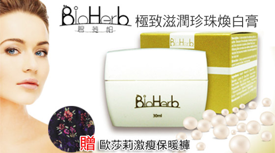 宅配【BioHerb碧荷柏】極緻滋潤珍珠煥白膏,最低一瓶只要298元,最少購二入再贈歐莎莉激瘦保暖褲!