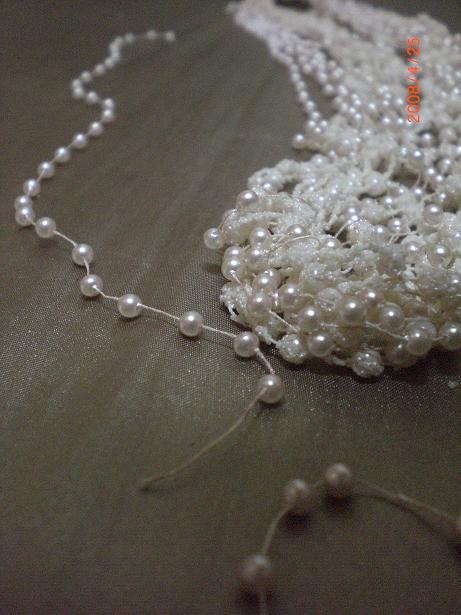 慢慢理開斷掉的部份、剪下、一一剝下珠子,用0.5mm的魚線穿成串(上圖-上)。然後固定、穿上鐵線、花帽、C型圈,就成了上圖-下的模樣~