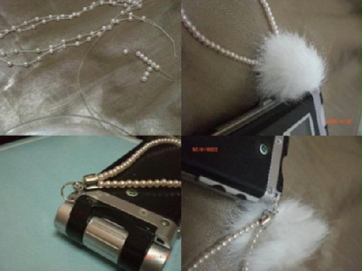 古董飾品改造。秀氣姑娘~粉色仿珠+兔毛手機吊飾