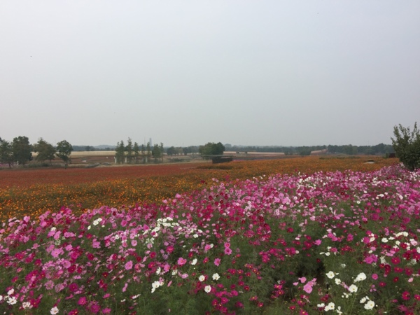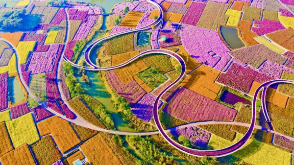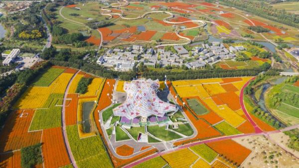 公園裡2000多畝花田,主要由紫色系、紅色系、黃色系三種色系組成,一年四季有50多種花卉接力綻放,隨著不同季節,變換不同花種。秋日時分,漫天各色菊花隨風搖曳,清香撲鼻,好一幅浪漫的田園風光畫。