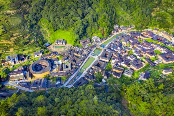福建土樓以生土為主要材料,摻上石灰、細砂、糯米飯、紅糖、竹片、木條等,經反覆揉、舂壓、夯築而成,具有聚族而居、防盜、防震、防獸、防火、防潮、通風採光、冬暖夏涼等特點。土樓一般高三至五層,一層為廚房,二層為倉庫,三層以上為起居室,可居住200至700人。