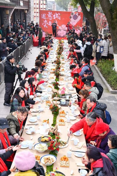 相傳名將伍子胥曾經在慈城打過仗,他死之前,對其部下講:「如果國家有困難,百姓斷糧,你們到城牆下掘土三尺,可得到糧食。」伍子胥死後,越國進攻吳國,城中軍民斷糧,百姓便按照他的遺囑挖開城牆,以「年糕城磚」為食,救人無數。從此以後,每逢過年,慈城家家戶戶都做年糕來紀念他的功德。 對於慈城年糕而言,鄉愁就是競爭力。 走在古縣城裡,年糕團、年糕片是隨處可見的小吃;民權路一頭的慈城年糕館,更是不少遊客首選的打卡地。年糕館內的年糕實驗室,有水稻種植場景、年糕手作親子體驗工坊、年糕文化憶集場景等。最受歡迎的莫過於年糕館內的主題餐廳,從傳統的薺菜肉絲炒年糕、鹹菜湯年糕,到新式的酸菜魚年糕、泰式咖喱年糕…,餐廳團隊研發出來的年糕吃法多達80種,從中挑選了適合大眾口味的一批年糕做法,人人皆能尋得自己所愛。 值得一提的是,年初,慈城全新發布年糕Logo、Slogan、IP。慈城年糕Logo把「慈」字進行圖形化的推演,融入年糕的形態。作為慈城年糕品牌的Slogan,提取了古城慈孝文化的優良傳統,將年糕親和而日常的祝福,傳遞到千家萬戶。慈城年糕的IP「小伍」源自傳說故事「城牆屯糧防饑」的主人公伍子胥,以萌態的形象,呈現一個兼具年輕活力與傳統底蘊的慈城年糕IP。
