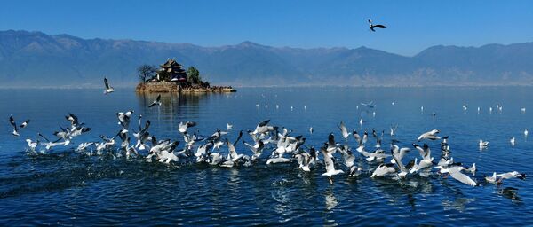 洱海東部的小普陀島,雖袖珍,卻享盛名。島形若金印浮於水面,又稱「海印」。傳說洱海蛟龍興風作浪,觀音便投下大印鎮壓。明崇禎年間,漁民在島上修建兩層歇山頂樓閣,供奉觀音。仙風徐徐,神霧繚繞,怪石林立,在石縫冒出樹木,遠眺似若天然盆景。