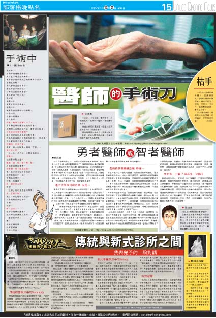 走外科 , 因為手術過程是精采, 開刀並不總是全身麻醉, 還有很多的手術是在局部麻醉下完成。 手術進行時, 病人會給蓋在布單下, 僅僅秀出手術部位, 以維持完整的無菌面。 蓋在被單下的人兒, 是清醒, 漆黑一片, 聽覺自是分外機敏。 漆黑一片, 聽覺是與外頭唯一的聯繫, 一字一句, 勾勒一幅圖像, 在刀房裡。 玲惠,麻煩上來幫忙一下。 志志對流動的護士姐姐央求著, 是顆腫大的頸部淋巴結,需要切片檢查。 可是我沒有穿衣服耶? 護士姐姐指的是無菌的刷手服。 因為局部麻醉的手術部位都較小,較表淺, 因此戴無菌手套就已足夠。 沒關係,來我下面。 通常,病人的腳側被稱為「下面」。 抓住這一枝。 「這一枝」是爪鉤,勾開手術部位。 用點力, 拉鉤要有點力道。 慢慢,慢,輕一點,輕一點。 力道拿捏實在重要。 對對對,對,就是這樣。 嗯,表示勾勾拉得很完美。 老經驗就是不一樣。 手術進行順利, 約莫一刻鐘後。 好,換你來上面。 同理, 「上面」指的是患者的頭側。 來,打開一點。 是了,淋巴結呼之欲出。 只要稍稍再加把勁。 半晌, 終於… 啊,出來了。 很好手術順利流暢。 記得那大叔離開刀房時, 一臉似笑非笑, 噫, 志志從頭到尾, 都是很認真, 正經八百的。 <小志志 > 小志志,1978 年生,鄉下孩子,小城裡長大,成為外科醫師。喜愛攝影寫作。 身處生與死的擺渡頭,細看人兒用生命譜下的,痴顛愛恨。 部落格開張一些時日,透過一雙手一雙眼,記錄人間悲歡故事,分享有情世界裡的平凡與感動。 《外科失樂園》志志看世界 http://tw.myblog.yahoo.com/surgeon-life/ 傳統與新式診所之間 【嘯狼】 我跟上國中的兒子漫步在台中舊市區街頭,這對平日總是被醫院大小工作綁住的我來說,可說是難得的享受,父子倆信步閒聊,恰巧經過了一間外表寒滄的傳統診所,小小的店面門可羅雀、燈光昏黯、招牌老舊,走廊底還停著一輛摩托車。看到這樣的診所,兒子有點不以為然說:「這樣的診所怎麼會有病人?」沒走幾步路,路邊又出現間裝潢華麗的牙醫診所,兒子頗為欣賞說:「這樣看起來才夠氣派嘛。」我心想這正是一個父親展現機會教育的Good Timing。 傳統破舊診所中的Somebody 我指著傳統診所的泛黃招牌對兒子說:「你仔細看看,這間診所的醫師畢業於何處?人家可是東京帝大的醫學博士呢!當年想必是名重一時的外科權威,這些老醫師,可說是照顧台灣早期民眾健康非常重要的一群人,你想想,如果他們的醫術不好,怎麼可能生存至今?這也就代表仍有許多病人願意信賴他們,絕對有其價值與貢獻在的。」 「那這些舊診所為什麼不跟隔壁的牙醫診所一樣,把門面弄漂亮一點呢?」兒子還是疑惑。 我回答道:「這些老醫師當然有資本,但他們會想,在現今的健保制度底下,增加的診療費是否能平衡新設備的花費?這樣把資本投入『軍備競賽』值得嗎?很多人在考慮後,都決定繼續守著小診所,照顧那些還願意信任他們的病人過日子。就像是現在7-11遍佈大街小巷,但仍有一些咁仔店一樣,這些醫師年紀雖大,但並不代表他們的醫術就比較差……」 兒子這時插嘴道:「那他們技術、知識一定是比較落伍。」 我笑著說:「那Microsoft現在推出最新軟體VISTA,但是我們能說十年前APPALE電腦的處理系統是很爛嗎?」 兒子似乎被我說服了,但仍倔強的說:「雖然他們是東京帝大畢業的名醫,但我生病還是不要給他們看病。」 新式華麗診所中的Nobody 聽到兒子這麼說,我也想了一下,說:「沒錯,如果你生病了,我還是會把你帶到新式醫院看病,畢竟現代醫療要求的標準已經不同,就跟隨身碟一樣,當年只有64MB,但現在1GB我都還覺得不夠用,這就是時代的不同。但是我要提醒你的是,做人不能看表面,小廟也會有大菩薩,大廟裡面也會有類似虎爺一樣的小神。」 我接要他仔細看看這間牙醫診所的招牌:「你看!這上面只寫著『前XX醫院醫師』,你知道這代表什麼意思嗎?XX醫院當然是家有名的教學醫院,但只寫著這樣的title,代表這間牙醫診所的醫師之前只是XX醫院的住院醫師,不過兩三年就自行出來開業了!畢竟他若當過總醫師或更高的職務,是不太可能只寫『醫師』而已。」 「當然,若履歷上是寫國外醫學大學,因為國外有完整的專科訓練,是比較可信的,但仍要注意,他是拿學位,還是『進修』而已?有的所謂『國外進修』,不過是花數週拿張證書而已。」 「所以我們選擇醫院、診所,最重要是先聽口碑,再看醫師履歷,當然設備也是很重要,畢竟沒有相關的設備,醫術還是非常受限。」 我的選擇 我和兒子並肩走在熙攘的街上,回頭望向那間冷清的舊診所,心中不禁有股淡淡的憂傷,我對傳統診所中的老醫師,堅守崗位不輟的貢獻,以及在歷史中的定位,致上崇高的敬意。但是我絕不會以這些前輩為榜樣,畢竟未來是Wal Mart的時代,我不認為小咁仔店還會有生存的價值。 而我,一定會在時不我與之前,維持平常一貫的姿態,從容地步下舞台,過我在醫院、病人以外的人生,而非停佇在城市中的小角落,成為供人憑弔的活化石…… < 嘯狼> 嘯狼,從小好勇鬥狠,路見不平非要仗義執言不可。 早年幻想當黑社會老大或俠客,縱橫江湖、行俠仗義而不可得,所以投身白袍之列,專攻重症骨科,一樣刀刀見骨。 一晃眼數十寒暑,回頭望,年輕夢想俱往矣,不勝唏噓。 身為台灣醫療業中失落的一代,念茲在茲的就是為年輕大夫爭取生存權力與重新尋回台灣漸漸失落的醫