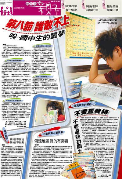 但是,「誰敢不上第八節課!」小盧表示,八年級剛開學,班導師就不斷呼籲,全班要「團結」、「最好全部參加第八節」。後來有少數同學沒交參加第八節的同意書,家長馬上就接到班導的「關切」電話,最後老師還是達成「目標」─全班參加。