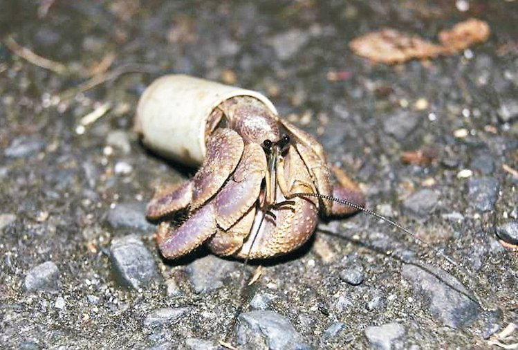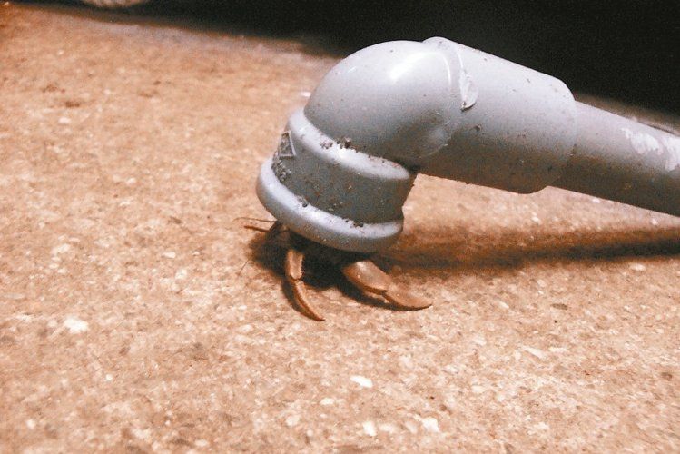 ●寄居蟹被迫住在廢棄水管裡。 報系資料照片
