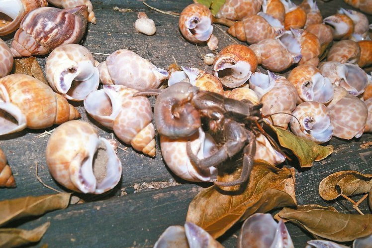 施習德說,寄居蟹必須隨著長大不斷的換殼,若找不到合適的貝殼,非洲大蝸牛的殼是不錯的選擇。寄居蟹要換殼時,不見得會附近正好有蝸牛殼。