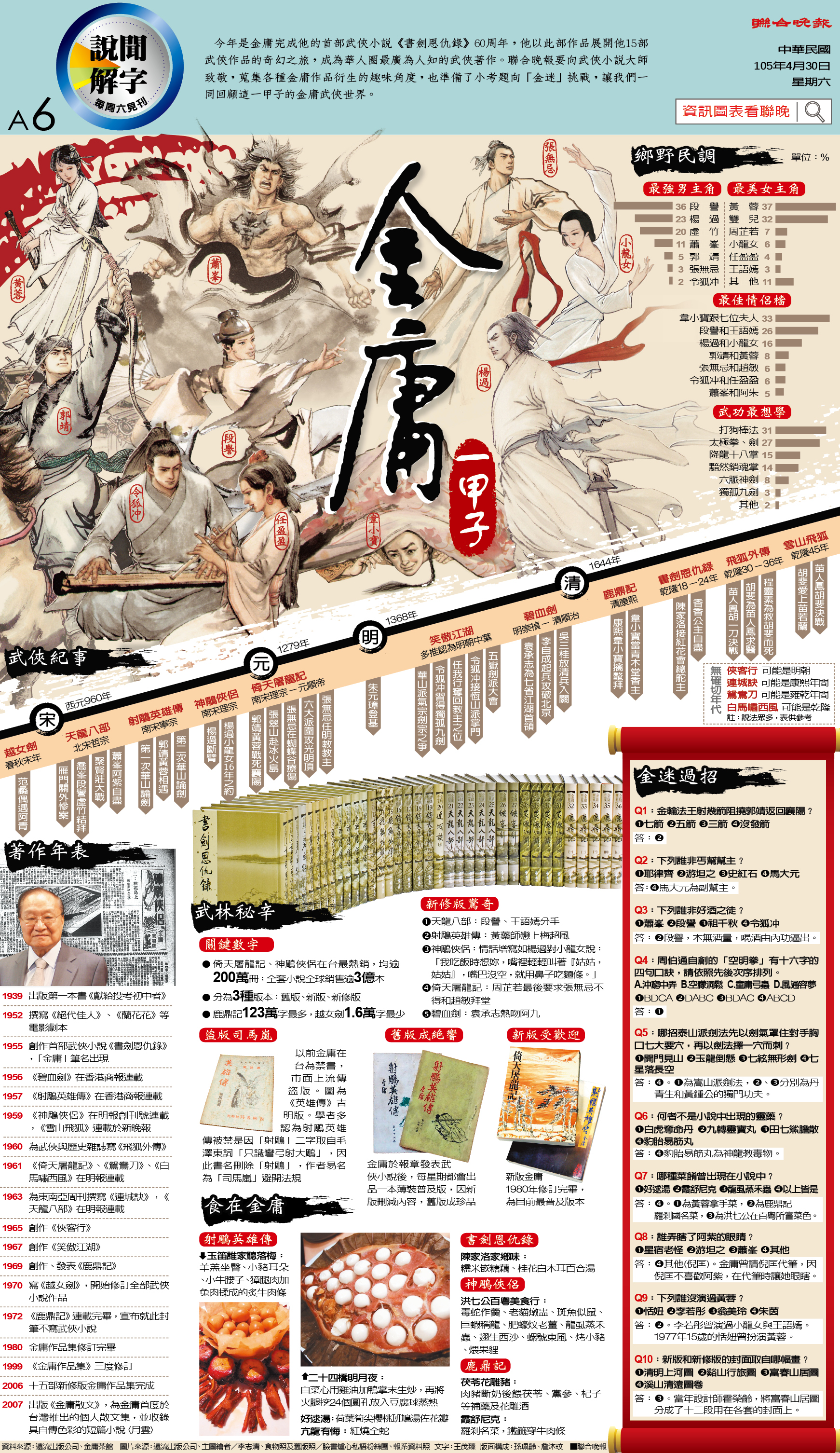 今年是金庸完成他的首部武俠小說《書劍恩仇錄》60周年,他以此部作品展開他15部武俠作品的奇幻之旅,成為華人圈最廣為人知的武俠著作。聯合晚報要向武俠小說大師致敬,蒐集各種金庸作品衍生的趣味角度,也準備了小考題向「金迷」挑戰,讓我們一同回顧這一甲子的金庸武俠世界。