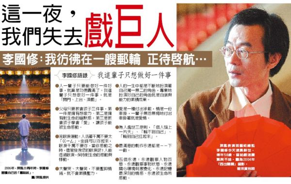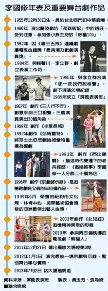「這是我第二次當兵,雖然是未知的旅程,一定會盡快回到熱愛的舞台」2012年1月1日,屏風表演班藝術總監李國修演完最後一場《京戲啟示錄》,謝幕前和太太王月手拉手,一起站在舞台上向觀眾保證,他將接受醫療計畫,這只是暫別舞台的驚嘆號,但過了2年多的時間,驚嘆號卻成了句號,李國修今天凌晨3時34分辭世,讓藝文界和眾多喜受他的觀眾,既震驚又不捨。
