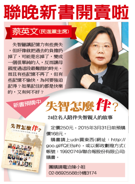 - 精選2015/03/21 10:30 【台北訊】台灣步入高齡化社會,調查顯示,每四位80歲以上的長者就有一人罹患失智症,失智症照護已經成為許多家庭壓力來源,聯合晚報出版「失智怎麼伴」一書,由24位名人陳述親身經歷,讓大眾更加瞭解失智症,以... 瀏覽:1,373迴響:1推薦:0