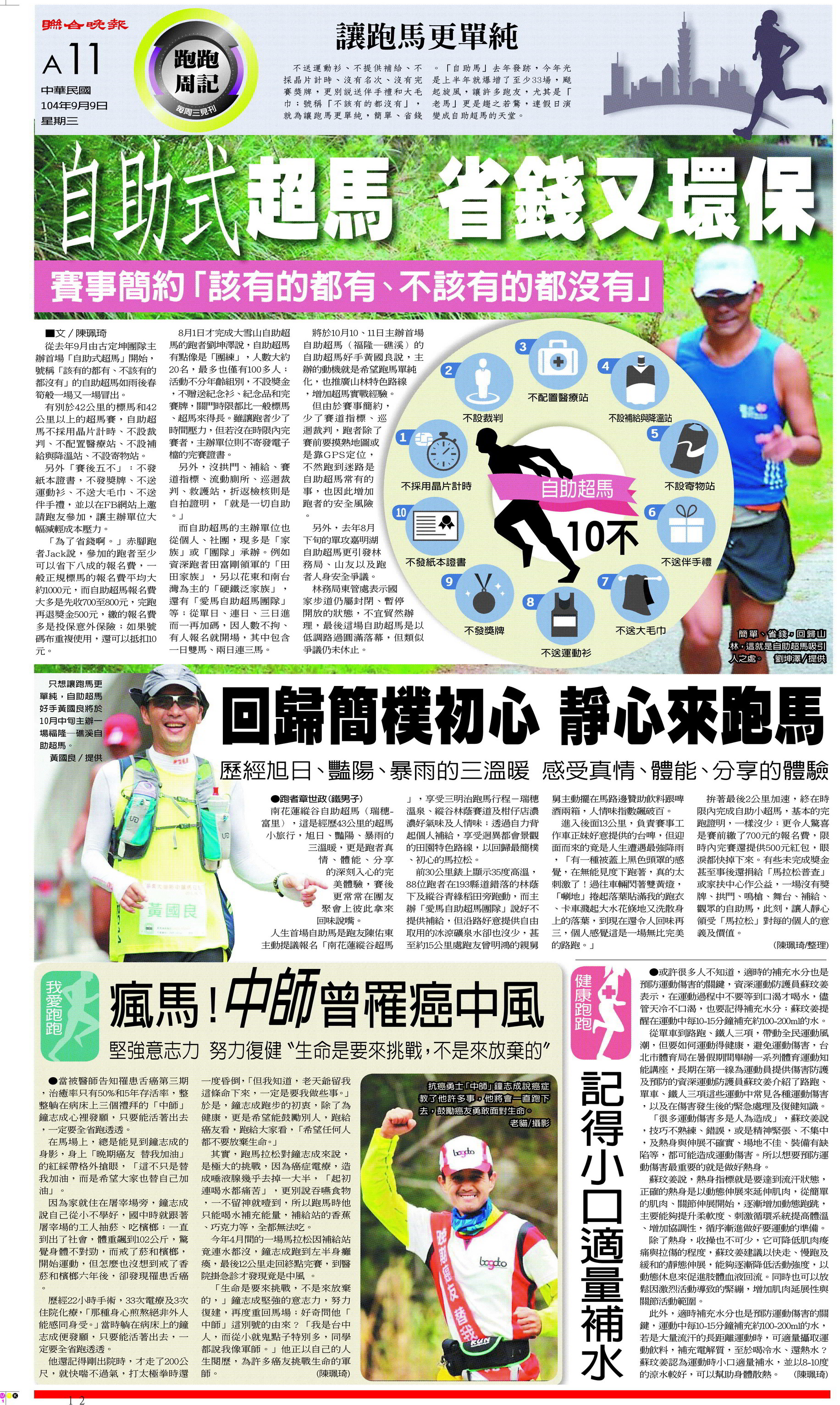 - 2015/09/23 14:53 10個人、200多公里跨夜接力,起、終點在不同縣市;沒有名次獎勵,而是希望跑者發揮團隊合作,替自己隊友補給、加油,考驗熱情、友誼和默契的超級接力賽。從白天到黑夜,再從黑夜到白天,像神話「夸父追日」般,... 瀏覽:864迴響:0推薦:10
