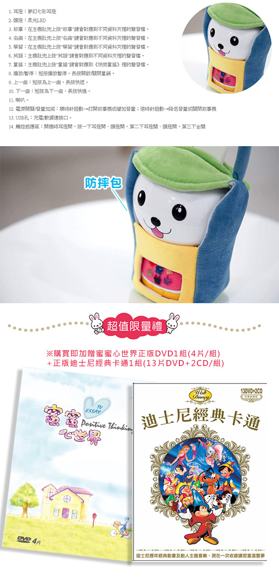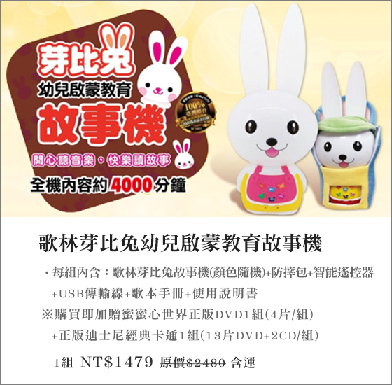 只要1479元(含運)即可購得原價2480元歌林芽比兔幼兒啟蒙教育故事機1組(顏色隨機出貨),購買即加贈蜜蜜心世界正版DVD1組(4片/組)+正版迪士尼經典卡通1組(13片DVD+2CD/組)。