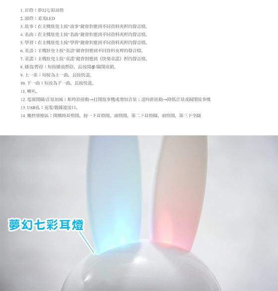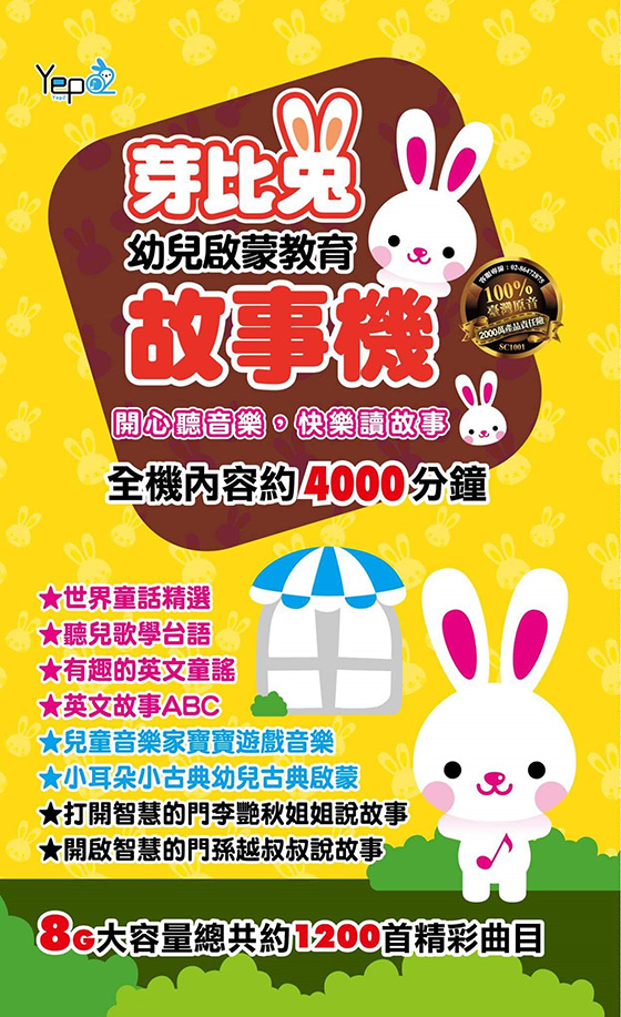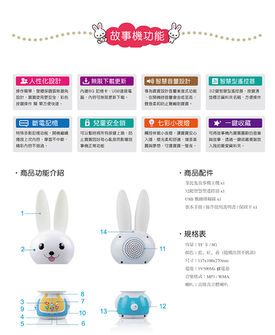 商品內容:歌林芽比兔故事機、防摔包、智能遙控器、USB傳輸線、歌本手冊、使用說明書