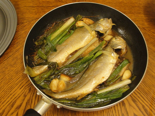 晚上,煎魚、炸蒜頭、煎薑絲,加醬油、水、糖,然後黃魚再入鍋,加入青蔥,小火燒15分鐘,布衣第一次的蔥燒黃魚完成了。